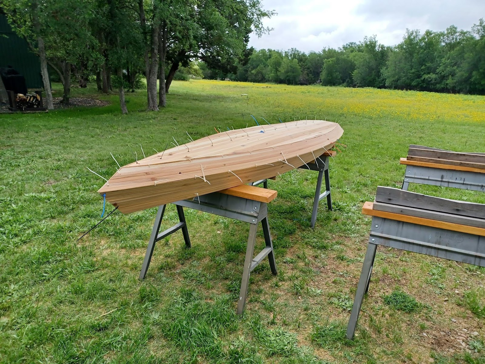 The boat is coming along. When you turn it upside down on the sawhorses its shape is not all that different from some of my boats (wide panel on bottom).
