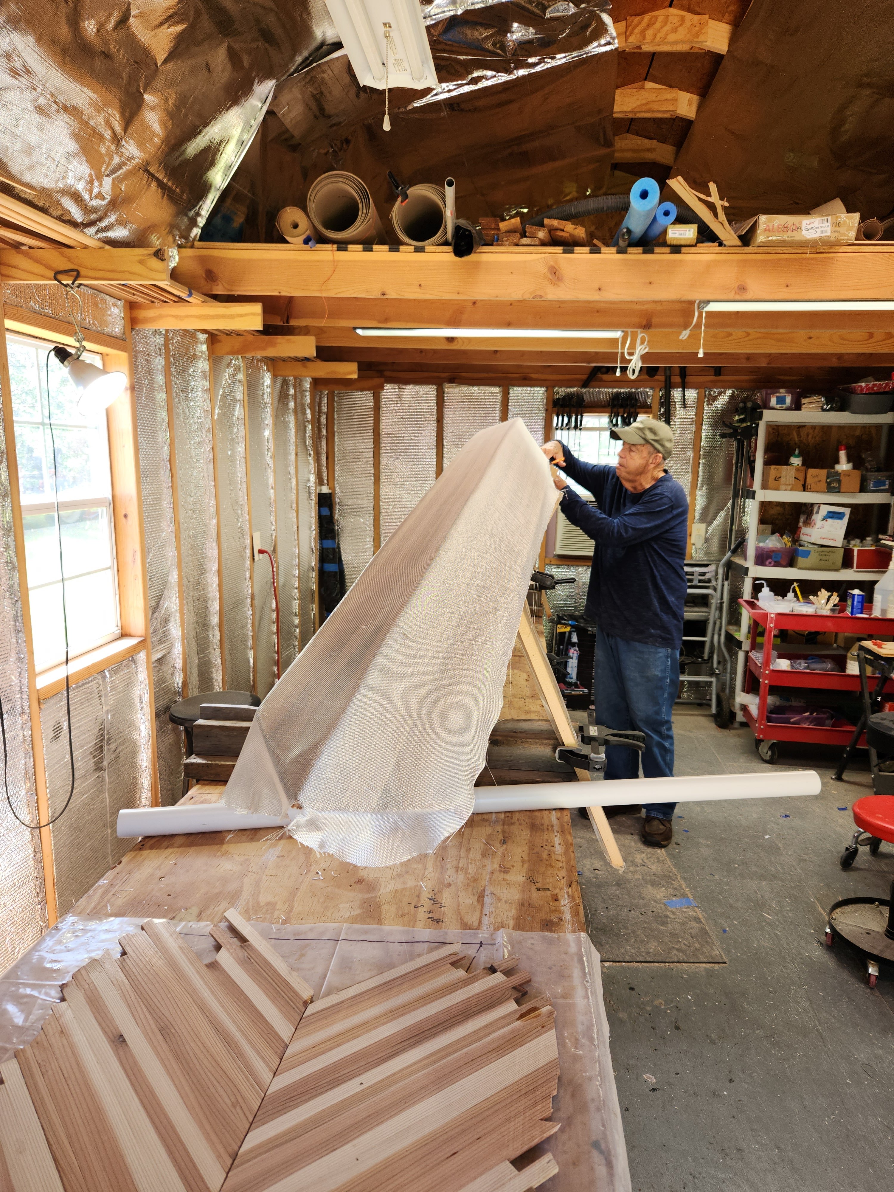 We’ve had 2 or 3 work sessions since I last posted.. The short and high sides are stitched in place. In this picture John is finishing stitching the right high (tumble home?) side