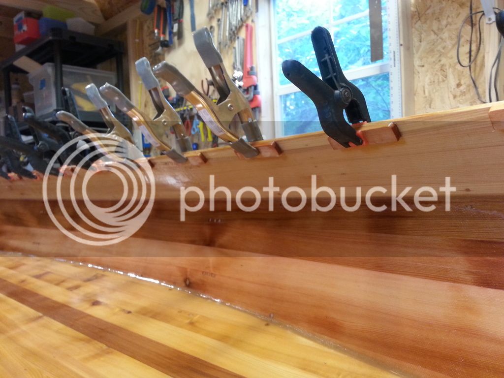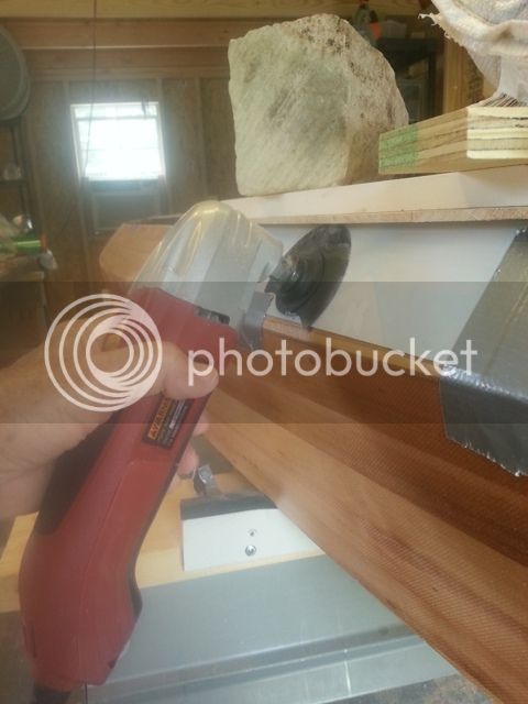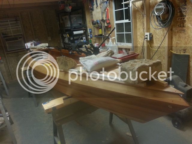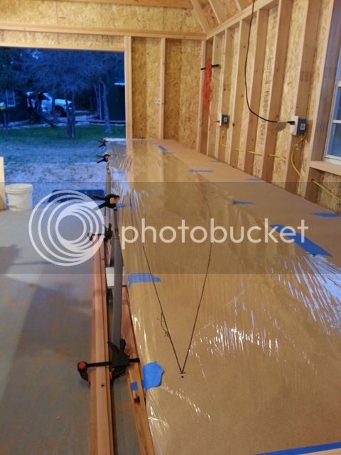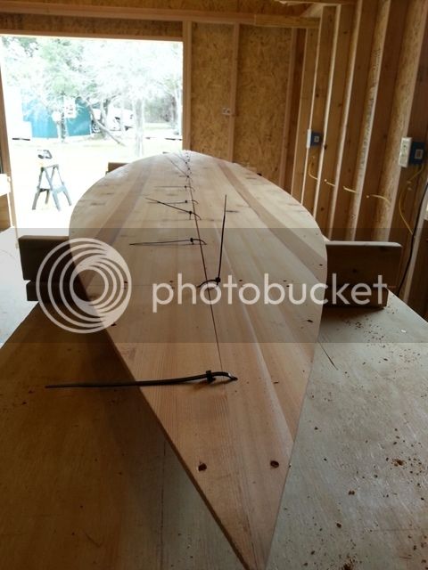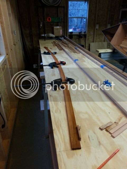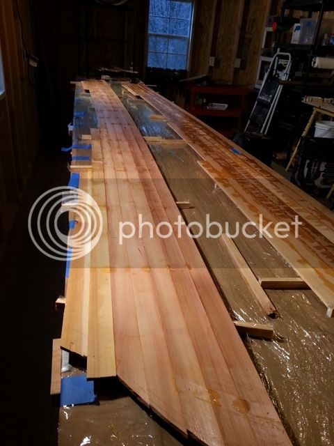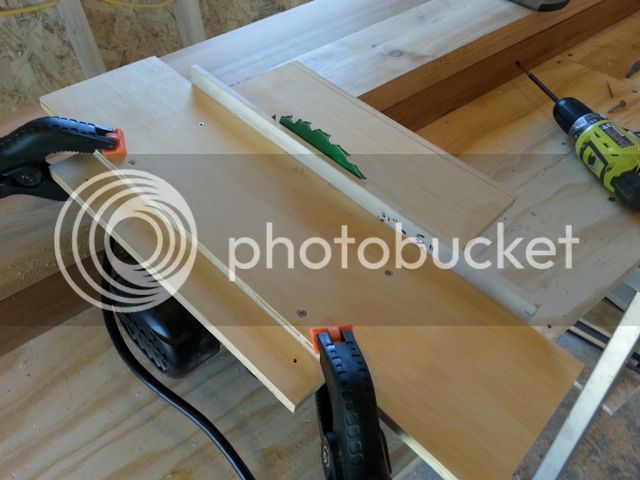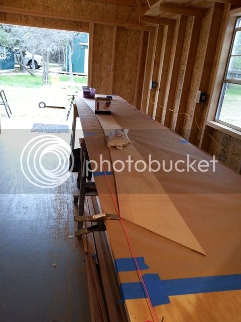 I used a 5/16” board to set the “fence” on the rip jig for my skill saw. This picture of the bottom is the second jig ½”ply, the first was made of 3/4 “ ply. It worked good practicing on a pine 2x4 but the blade wouldn’t reach deep enough when I changed plans to 2x 6 rough cut. The plan for lumber was 8’ 2x6, but I happened on 2, 2x6 x 14’ rough cut boards. They made 30, .31” strips, enough for the basic boat. I screwed some sacrificial support to the underside of my table to help support the 2x 6 off the edge. Then probably went overboard when I drilled the 2x 6 and fastened it to the table with a finish nail in the corner at each end—but it was stable.