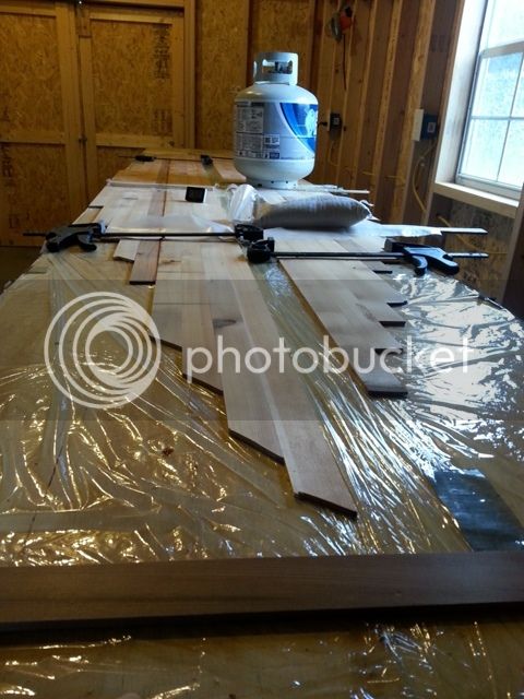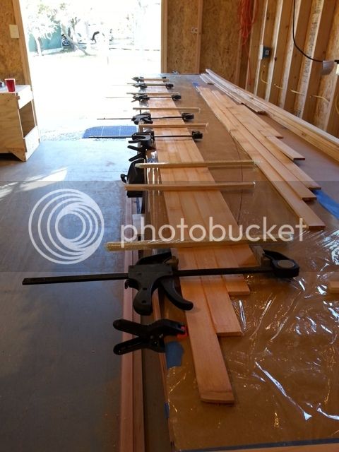 Gluing the bottom panels in two pieces so they will be narrow enough go through the planer. I didn’t plane these before gluing, because I thought I’d save a step. I think I will plane the side strips down some to make clamping more uniform. Any of you have opinions about planning some thickness down before gluing?