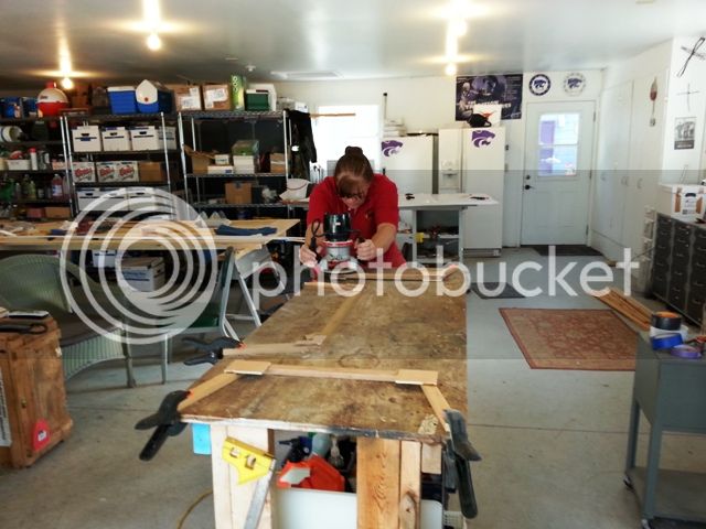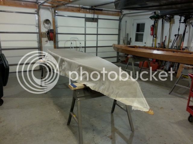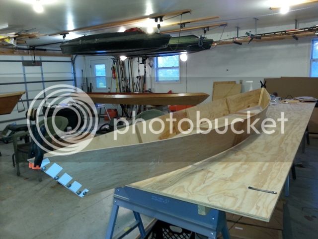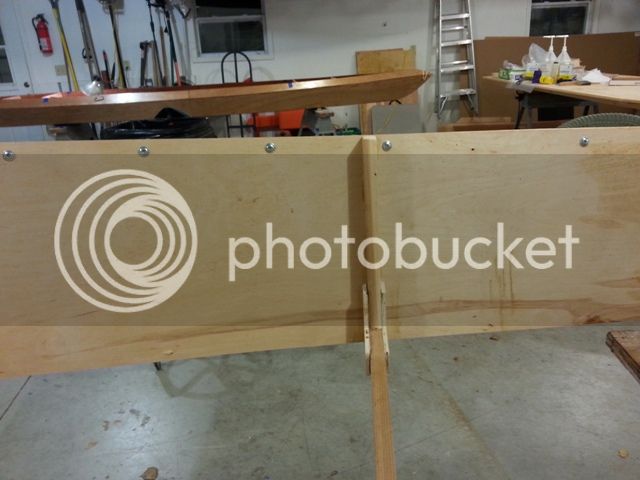 The UJ plan stem is complicated and hard to cut so she simply cut the two main angles on the table saw. Also this was about the time I had posted an end pour question and Ron replied he carved a stem and glued in place. So instead of fighting the bend to screw the sides to the stem, we duct taped the ends, glued in the ribs, then stems, using screws to temporarily hold in them in place. This was much easier than the procedure in the plans.