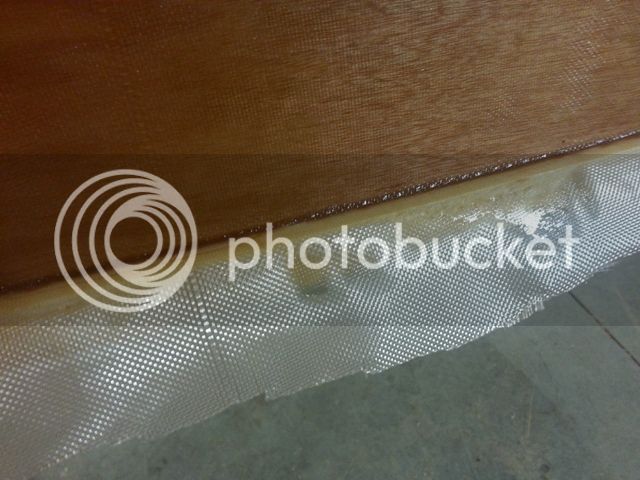 Outside is 6 oz cloth, one piece wet out with a roller and squeegee. We carried the wet glass down to the outside edge of the rub rail.